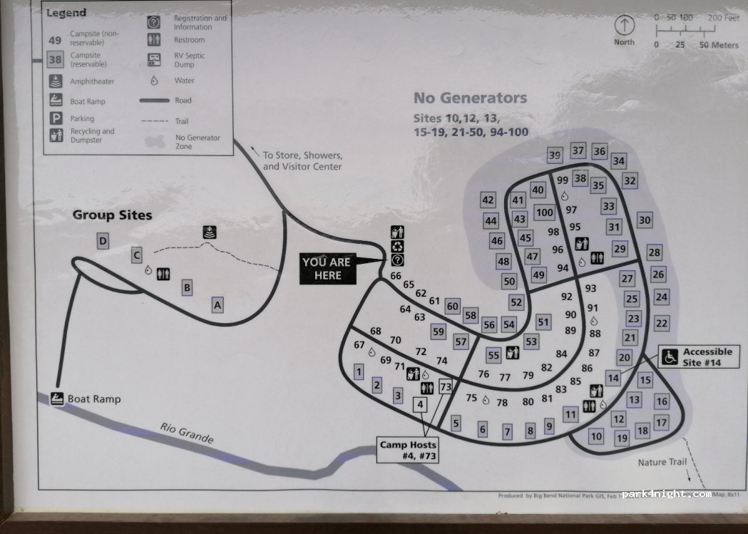 Situato in un boschetto di pioppi e alberi di acacia, il Rio Grande Village Campground si trova vicino al Rio Grande. Altitudine: 1.850 piedi. Strade asfaltate collegano ogni campeggio e aree erbose separano ogni sito. Toilette con sciacquone, acqua corrente, tavoli da picnic, griglie e alcuni rifugi sopraelevati. Stazione di scarico nelle vicinanze. I campeggiatori amano il birdwatching, le escursioni, l'esplorazione. Un negozio di campeggio con docce e un centro visitatori del parco si trovano nelle vicinanze. Aperto tutto l'anno. È NECESSARIA LA PRENOTAZIONE. Nessun campeggio primo arrivato, primo servito. Gli incendi di legna e gli incendi a terra NON sono consentiti in nessuna parte del Parco nazionale di Big Bend. È consentito un fuoco di carbone in una griglia fuori terra; le ceneri devono essere imballate. Sono ammesse stufe a combustibile liquido.