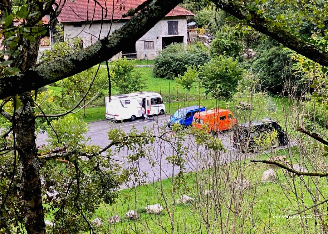 One of the best parking we stayed !!! River enarby you can swim in it, big green space for kids to play, even a fireplace, small village shop 5min nearby, picnick tables. Services by cost 5€ (including empty toilet and water). Good satelitte and 4G. Thnx to the community.