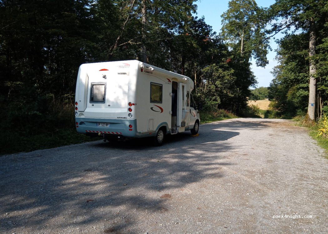 Parking très en pente à proximité d'une forêt. Un peu de passage le matin mais rien de gênant. Jolie forêt avec balade sympa. Le barbecue ne peut pas être utilisé actuellement.