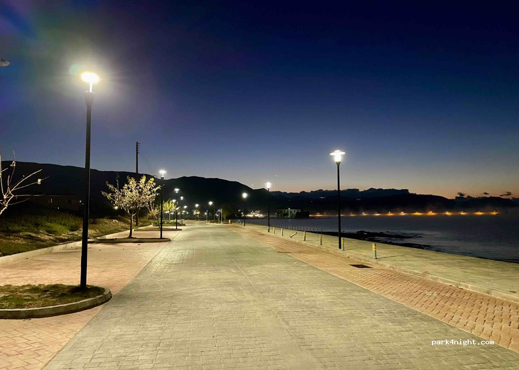In der Tat ein schöner Platz. Wenig Verkehr. Es gibt auch Parkbuchten, die für mehr als 7 m Länge ausreichend sind. Ansonsten rechts von der Strasse direkt am Meer. Sehr breiter und sauberer Gehweg. Nachts beleuchtet.
