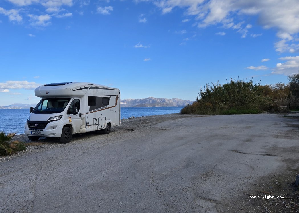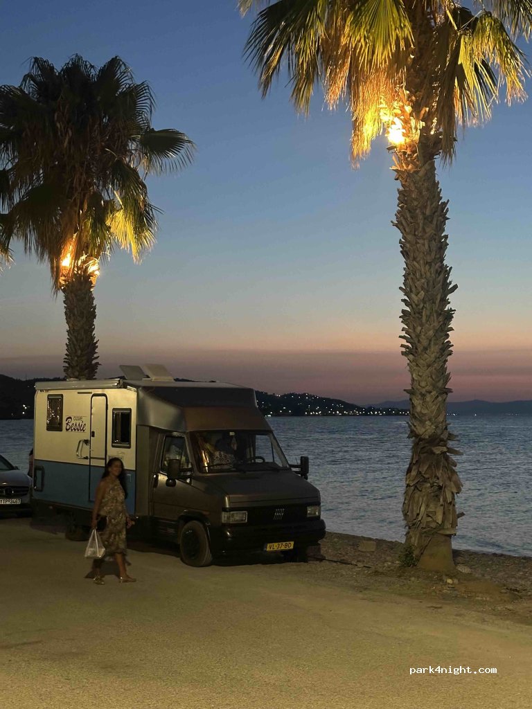 Al final de la calle de los restaurantes. No hay señales de prohibición de caravanas. Estás justo sobre el agua, sólo piedras. El callejón sin salida también sirve como punto de encuentro o aparcamiento para que los lugareños puedan contemplar el mar; en noviembre hubo algo para nosotros hasta las 21 h. Es posible practicar windsurf, olas altas con vientos fuertes.