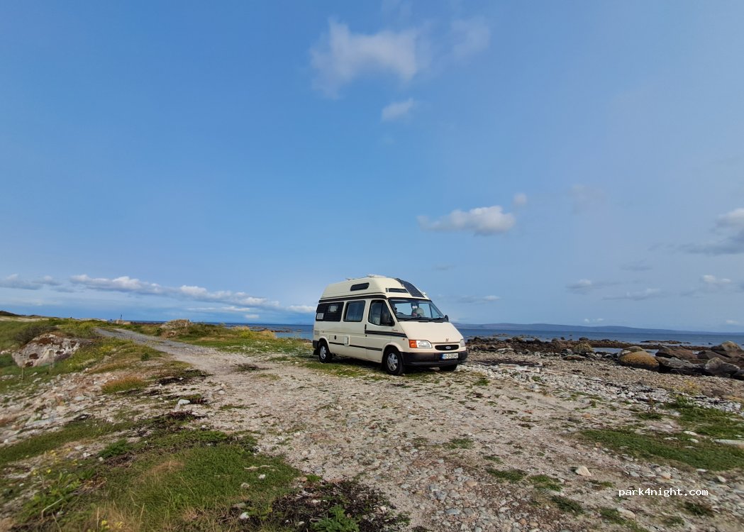 Great spot in Galway Bay with views of the Burren, Cliffs of Moher and the Aran Islands. At the end of a path, feet in the water. Very quiet at night. For small van It's impeccable. Place of walk very frequented by locals until early evening. If you want to continue to enjoy, thank you to respect them and the environment.