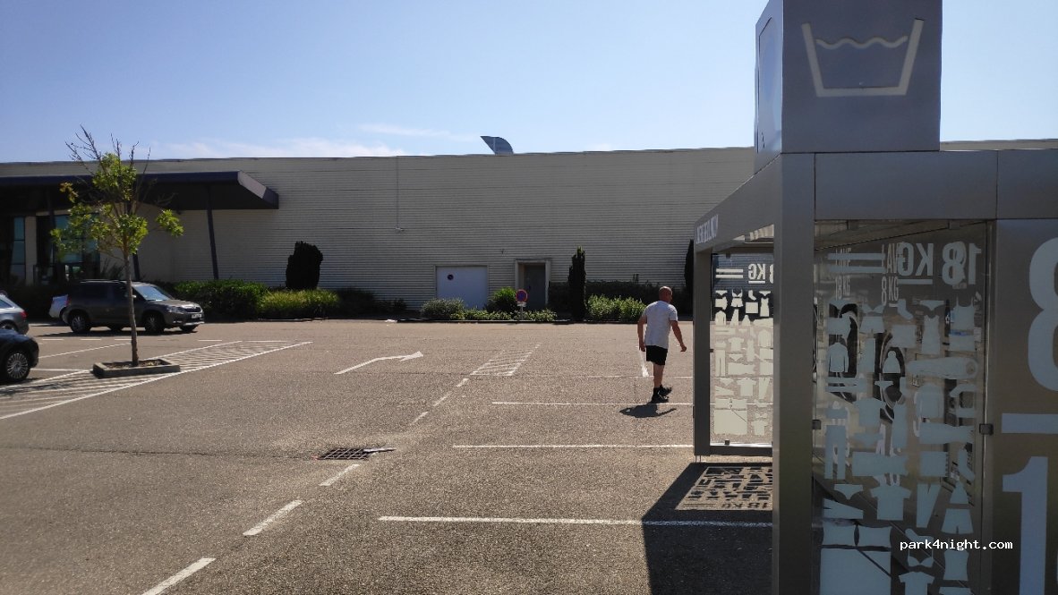 Parking Super U Marckolsheim, there is a gas station and laundry. At the edge of a road but little used at night. For our dog friends, there are the fields in front to walk around. There is also a pool next door.