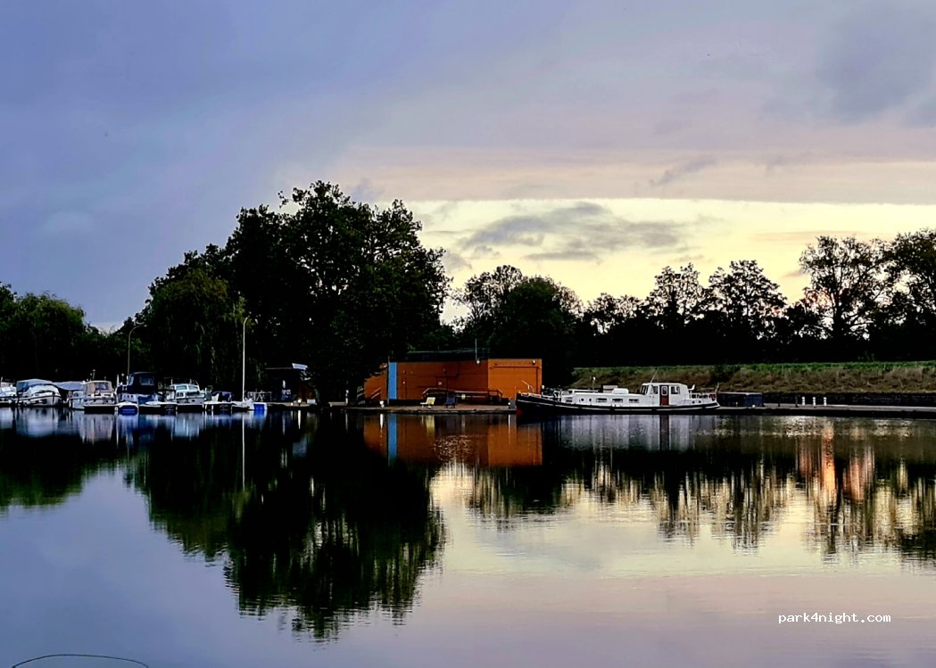 Speziell für Wohnmobile reserviert, 6 Plätze auf sehr gut befestigtem, ebenem Gelände. La Marine Bar-Restaurant nebenan. Blick auf die Kanalsackgasse und die Lastkähne. Kein Service. 1 km vom Stadtzentrum entfernt.