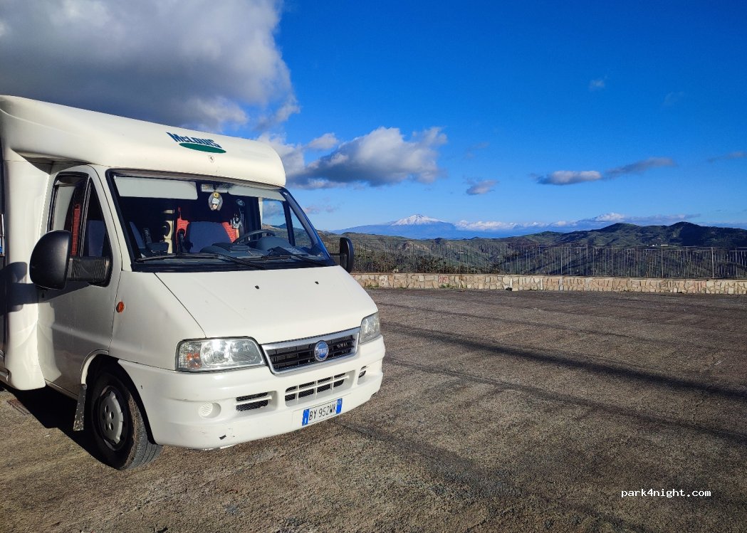 Parking en bordure de ville. Superbe vue sur l'Etna. Magasins de la ville très sympathiques quand nous nous sommes arrêtés et utiles pour faire le plein.