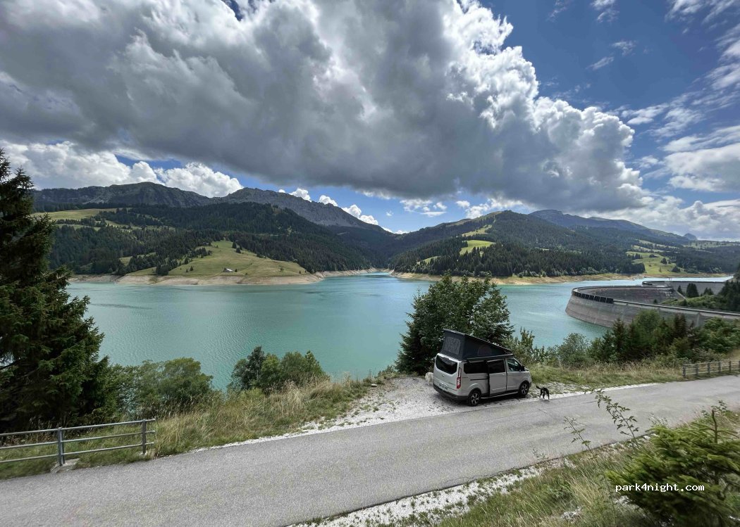 Magnifique endroit, plusieurs petites place au bord de la route. Par contre, ce lieu est vraiment très fréquenté, je suis arrivée à 16h et j'ai pris l'une des dernières place avec vue sur le lac dans la descente pour la barrage. Beaucoup de passage de voiture et de personnes durant toute la soirée malgré que ce spot soit isolé. Magnifique mais vous ne serez pas seul !
