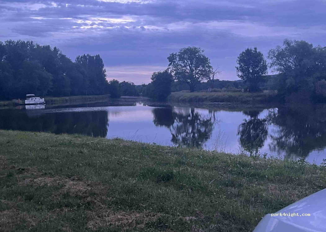 Mooi locatie aan het water. Parkeren in het gras, let op dat het niet te drassig is. Anders zijn er verderop parkeerplekken met gravel. Wij hoorden wat muziek van het restaurant (op een zondag) maar dat was verder niet storend, met name omdat het geluid van de stuw bijna alles dempt.