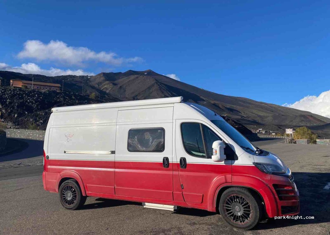 amazing oportunity to spend the night on Etna! in the night its free, for half a day we paid 3.5 eur for a van (rv is 12 I think) its a parking place, no facilities. Just open your botel of wine in the evening and enjoy the moment, Etna is magical.