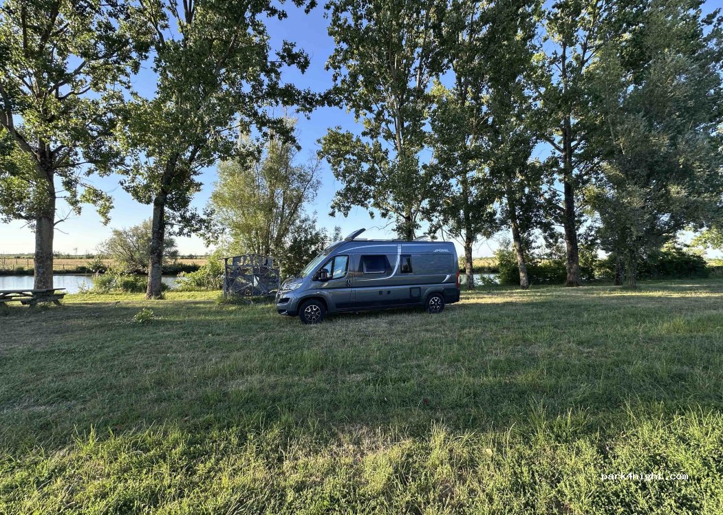 Superbe endroit entouré de nature avec vue sur le canal et le pré des vaches/chevaux juste en face. Nuit au calme complet, pas de passage de voitures, lampadaires éteints vers 23h et aucun autre bruit; les toilettes sont simples mais propres et ont été nettoyées lors de notre passage. Si vous cherchez un spot au calme près de La Rochelle, le détour vaut clairement le coup