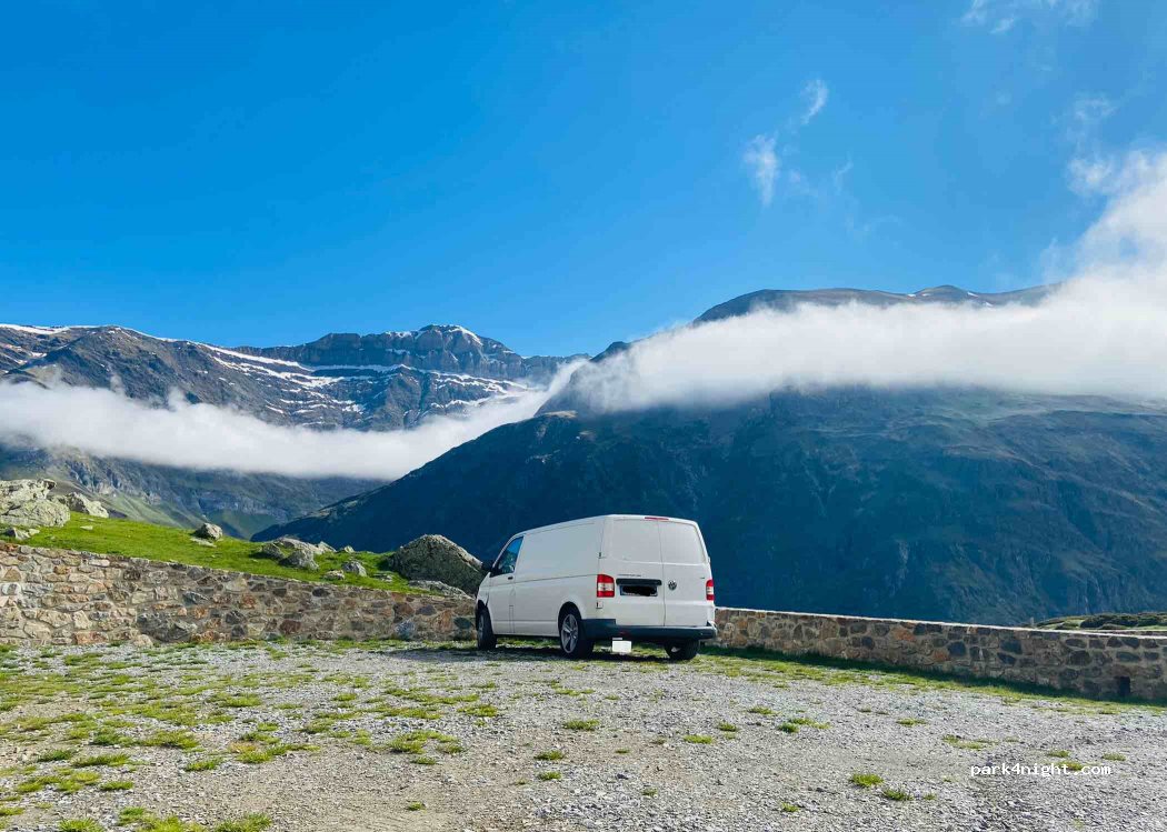 Parking gratuit, superbe endroit pour la nuit, on entend le bruit de la rivière et de la cascade. Toilettes publiques. Altitude 1500 m.