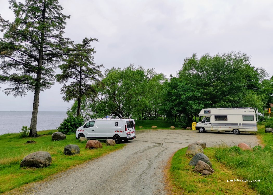 Very nice parking lot directly between the road and the sea with a view of the Öresund Bridge. Swimming only after a long hike on very shallow water possible. Surprisingly clean public restrooms. Max stay 4h.
