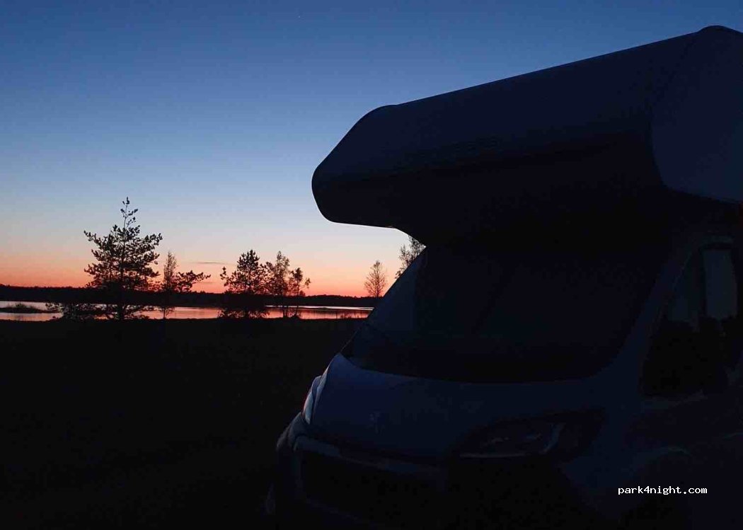 Nachts nicht als Parkplatz zu erkennen, hatten aber eine ruhige Nacht. Morgens standen in der Nähe am Weg zwei Auto, vermutlich Angler. An einem Strommast neben den Bäumen befinden sich ein paar Steckdosen. Haben sie nicht benutzt und wissen auch nicht ob das erlaubt ist. Strom war aber drauf.