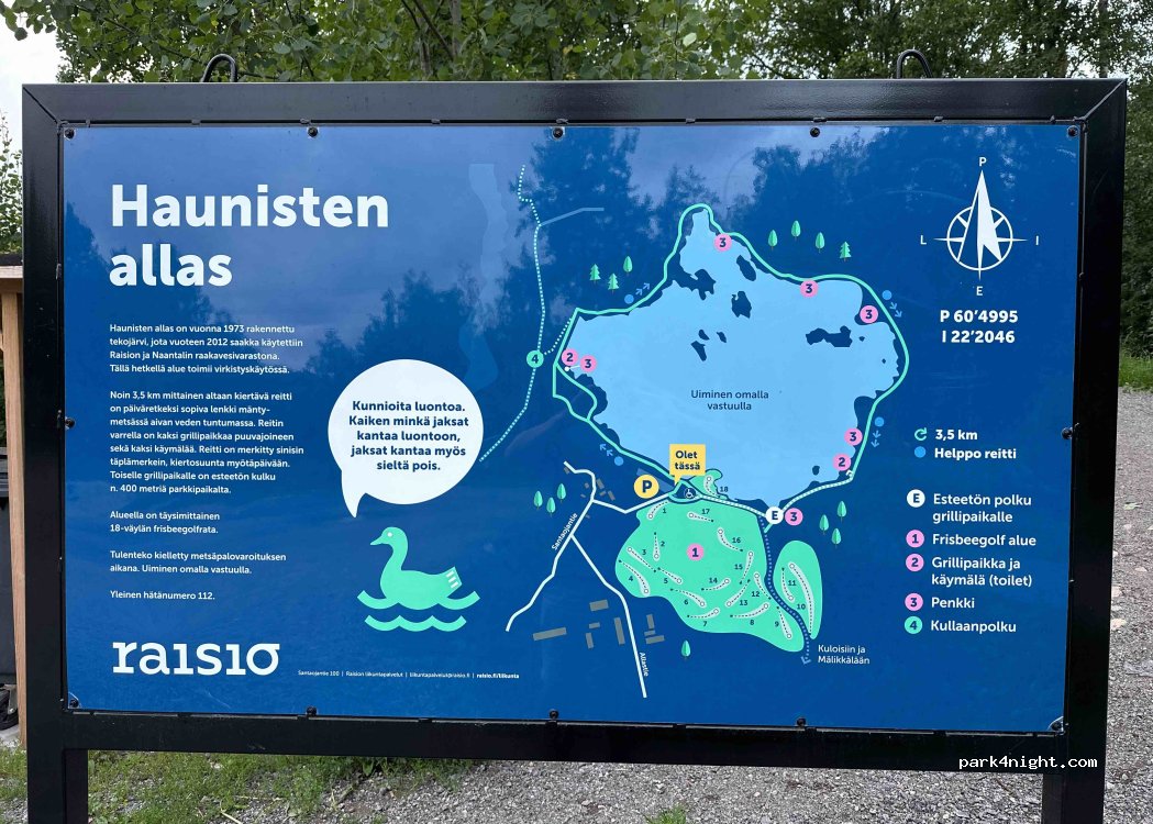 Wir standen hier zwei Nächte, Turku ist mit dem Fahrrad gut zu erreichen. Toilette ist gut nutzbar (Plumpsklo, Klopapier selbst mitnehmen). Spaziergang um den See lohnt sich. Frisbee-Golf unbedingt ausprobieren.