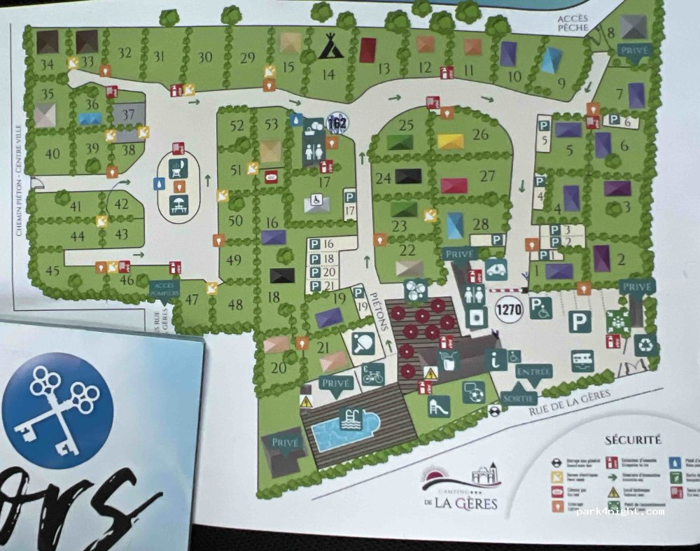 Camping à taille raisonnable en centre ville, calme, propose des activités. Sanitaires propres, semblaient neufs et avec équipement bébé. Emplacement avec de l’herbe et plat. Entrée du camping petite et avec code.
