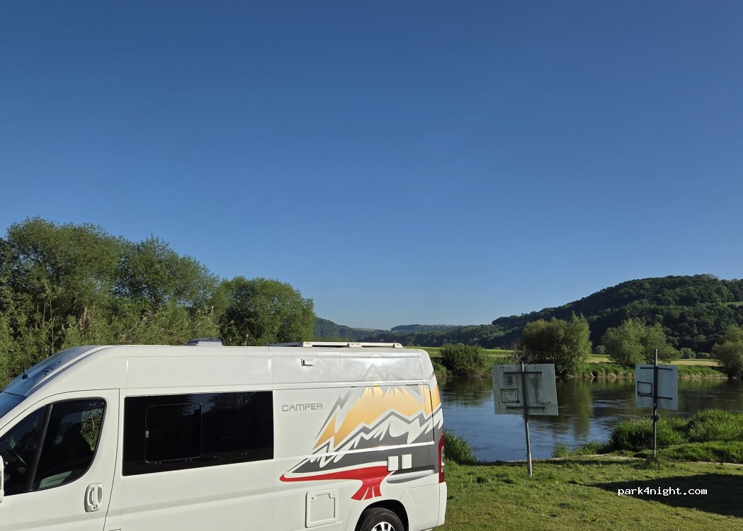 Sehr schöne Wiese als Parkplatz ausgeschildert. Neben einem Imbiss mit Liegen und Bänken direkt an der Weser. Sehr saubere Toilette tagsüber nutzbar. Die Nacht war ruhig, tagsüber relativ viel Trubel, viele Radfahrer, alle freundlich.