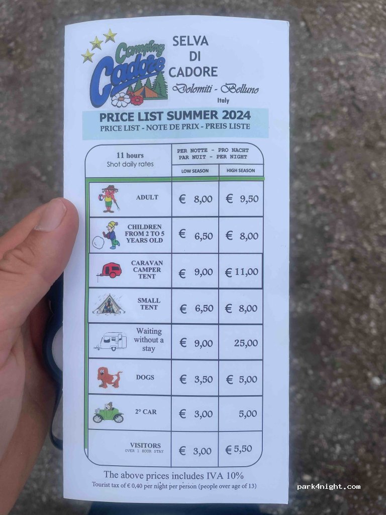Huge campsite with over 200 spaces, many occupied by permanent caravans. Reception opens at 3.30pm. Check-out at 11am. Lots of water fountains. Showers, toilets, wash up, laundry. High/low season prices shown in photos.