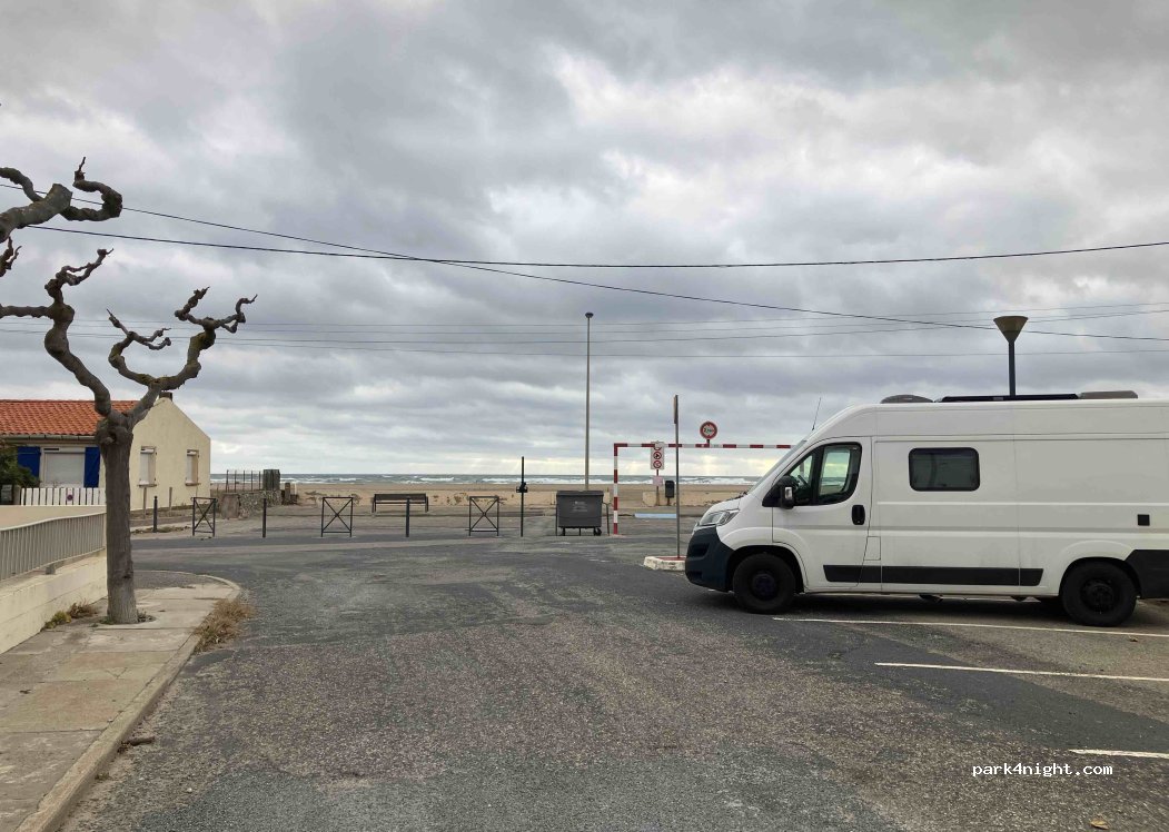 Petit quartier tranquille ou on se sent en sécurité pour la nuit. Les fourgons de moins de 2.15m peuvent passer sous la barrière et être les pieds dans le sable. Pour les plus gros vous pouvez vous stationner juste avant la barrière il y a une dizaine de place et vous serez à 5 mètres de la plage quand même. Il y a des habitations autour donc restons discret :)