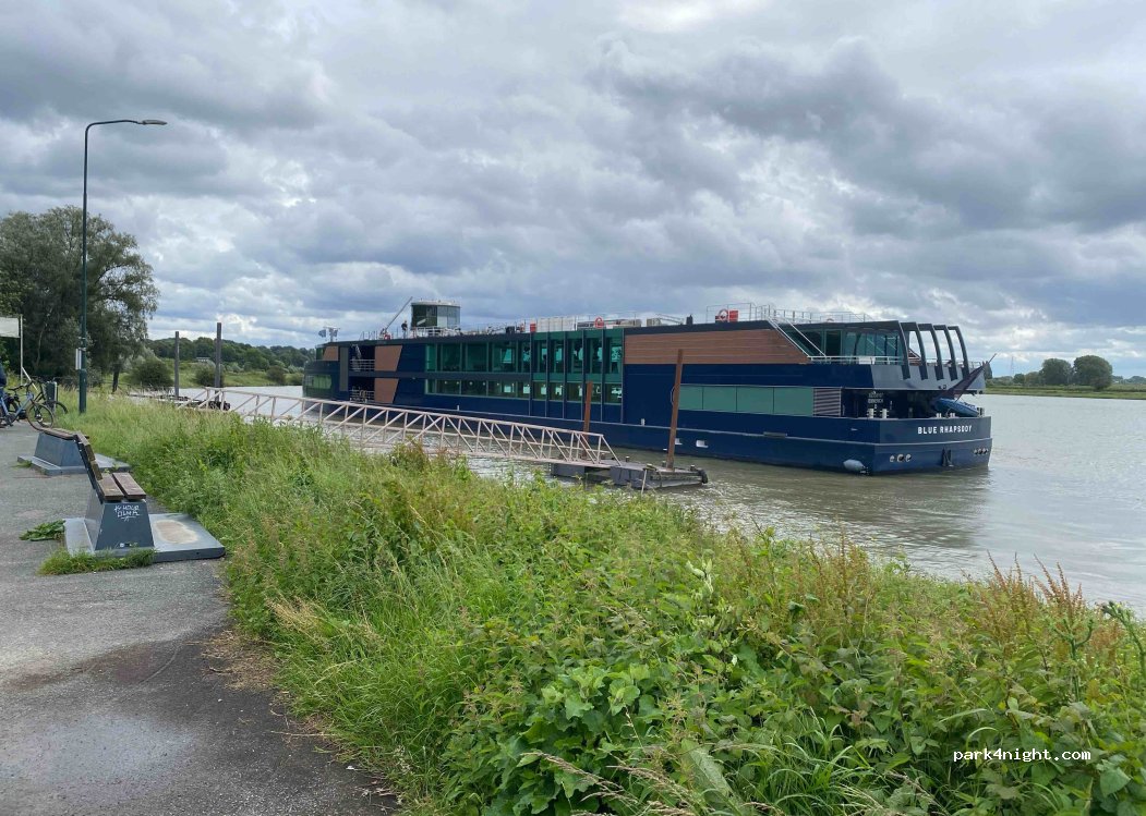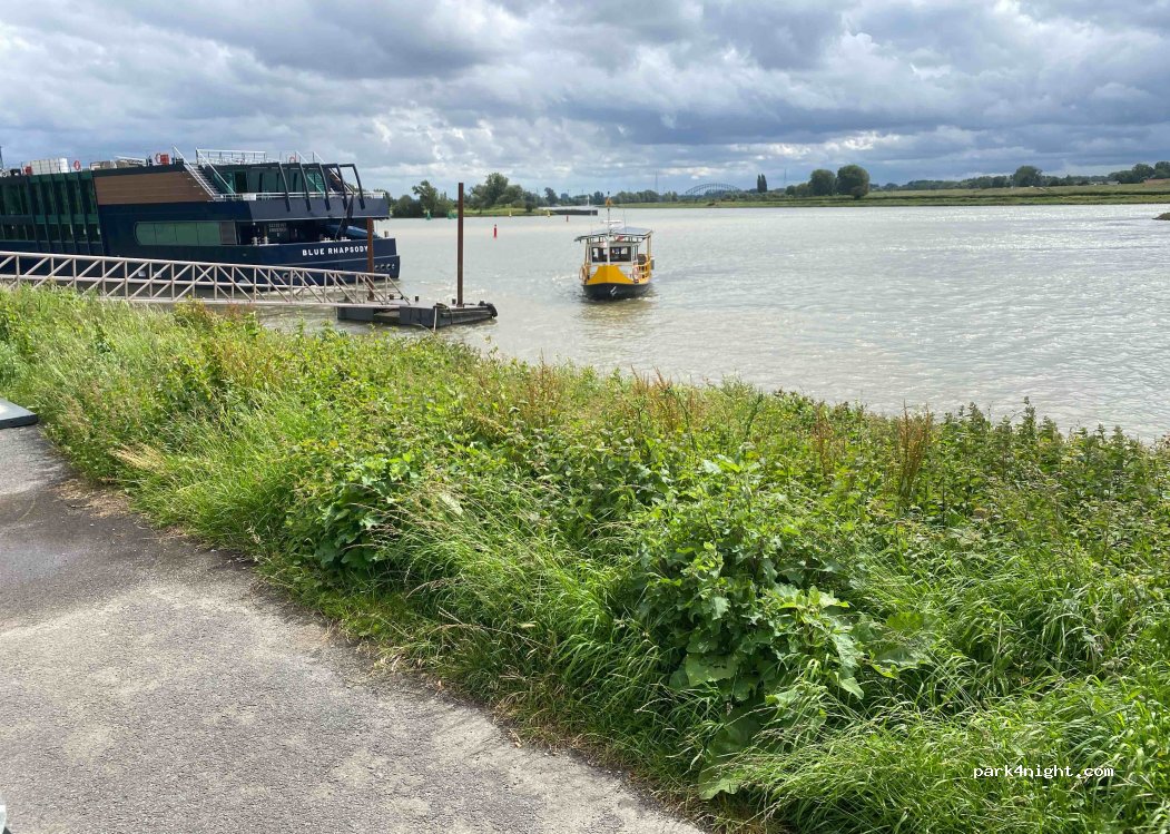 Parking next to the river, wide view. Very peaceful at night. A lot of birds. The place has behind the parking stop a nice lane of grass. There is a little ferry that transports people and bikers the whole day. We slept there. Came in the evening and went in the morning for a bike ride. Very quiet in the morning but through the day there is more traffic. When we came back there where many visitors, a coffee and ice truck. The ferry goes at 07:00 through the week and in the weekend at 10:00. We where there in the weekend. Super spot!