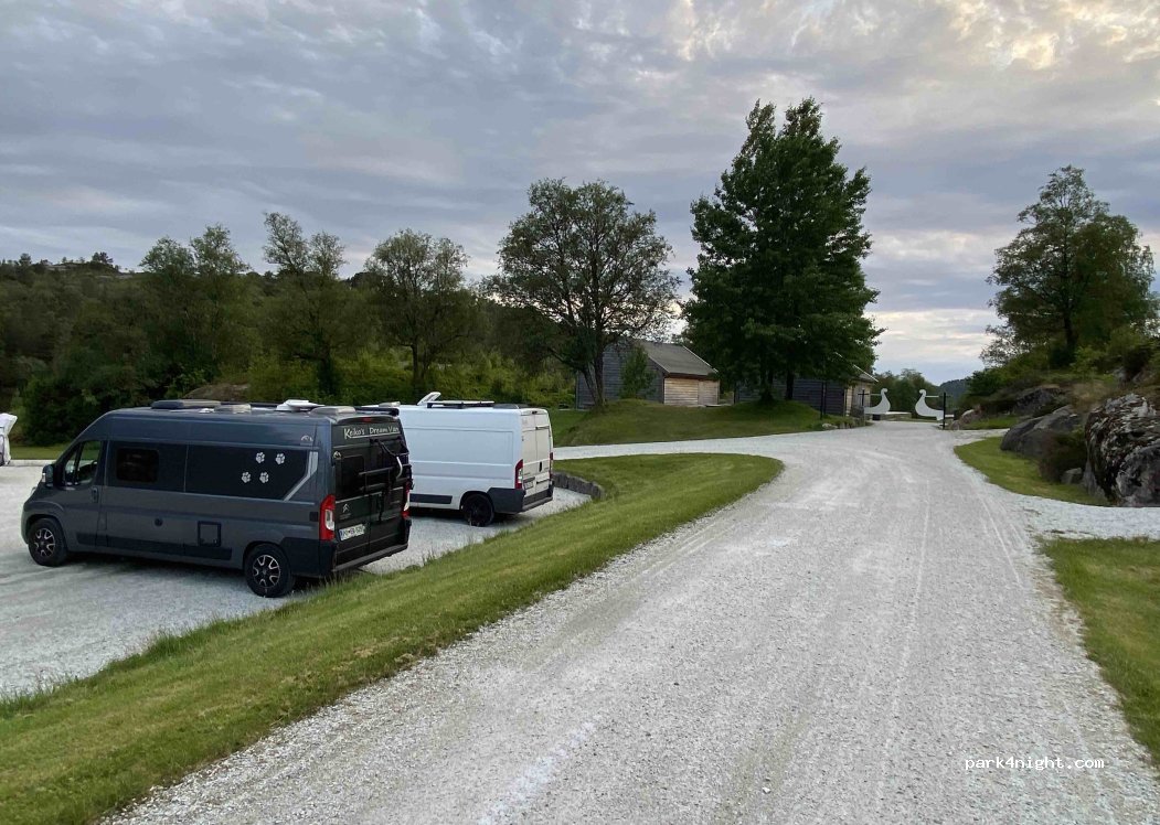 Free parking at the Tusenårsstaden Gulatinget (large park with walks and picnic areas) with no parking at night. Shed with toilets and showers (10 Nok / 5 min). Faucet for water filling available. Very nice park by the sea.