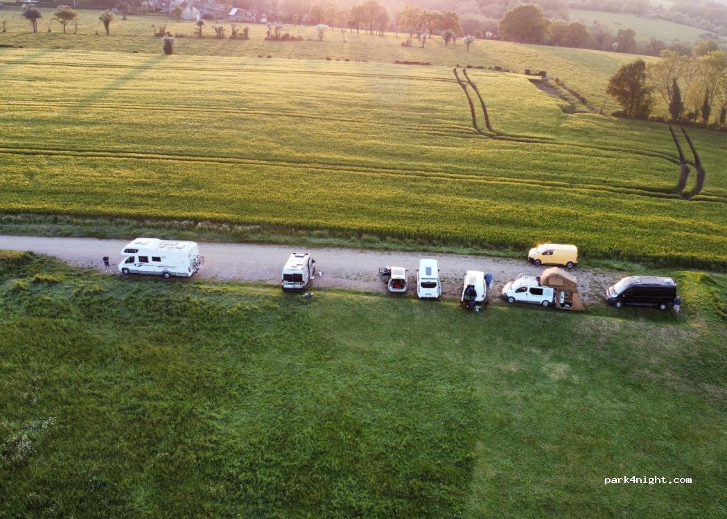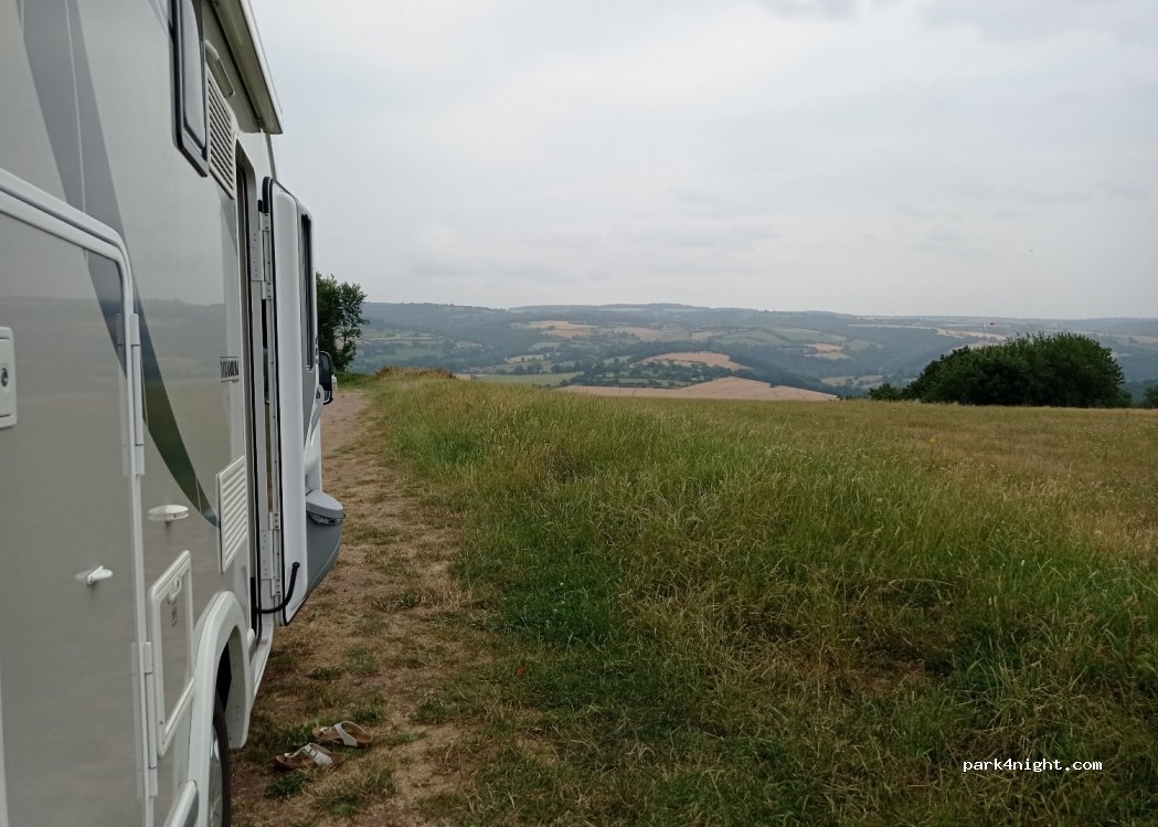 Au milieu des champs, sur les lieux d'un spot de vol libre en parapente. Superbe paysage, de la place pour une quinzaine de camping-cars. Places un peu pentues, prévoir les cales. Très calme et reposant