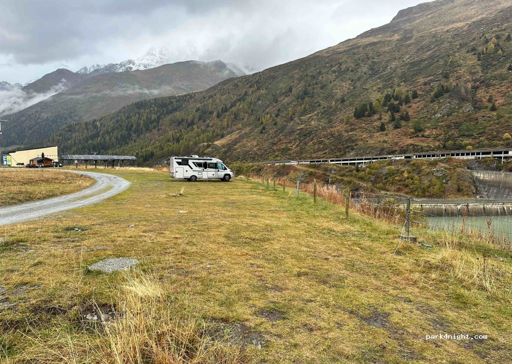 Ideale per trascorrere una notte appena entrati in Svizzera dal Passo. Silenzio, non si sente il traffico del tunnel, buio totale. Strada accessibile e larga. La diga di notte fa davvero impressione! Qualche braciere trovato.
