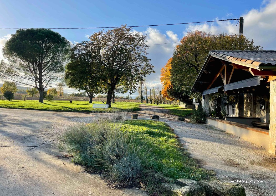propriétaire sympathique. Grand parking sur herbe, énormément de place, la plupart en autonomie au milieu des champs et arbres. arrivés vers 21h sans souci, accès libre. participation dans la boîte si l'accueil est fermé. Au top pour une halte dans la vallée du Rhône. on entend tout de même la nationale au loin mais rien de gênant.