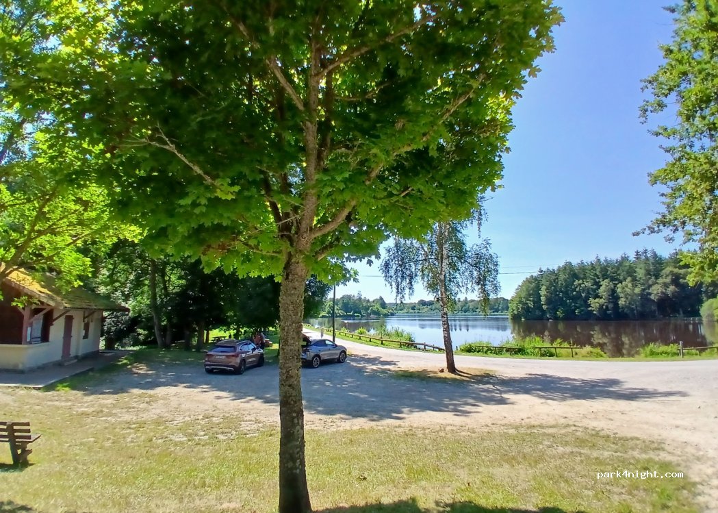 Spot au calme, des tables de pique-nique au bord de l'étang, un parking pour la nuit