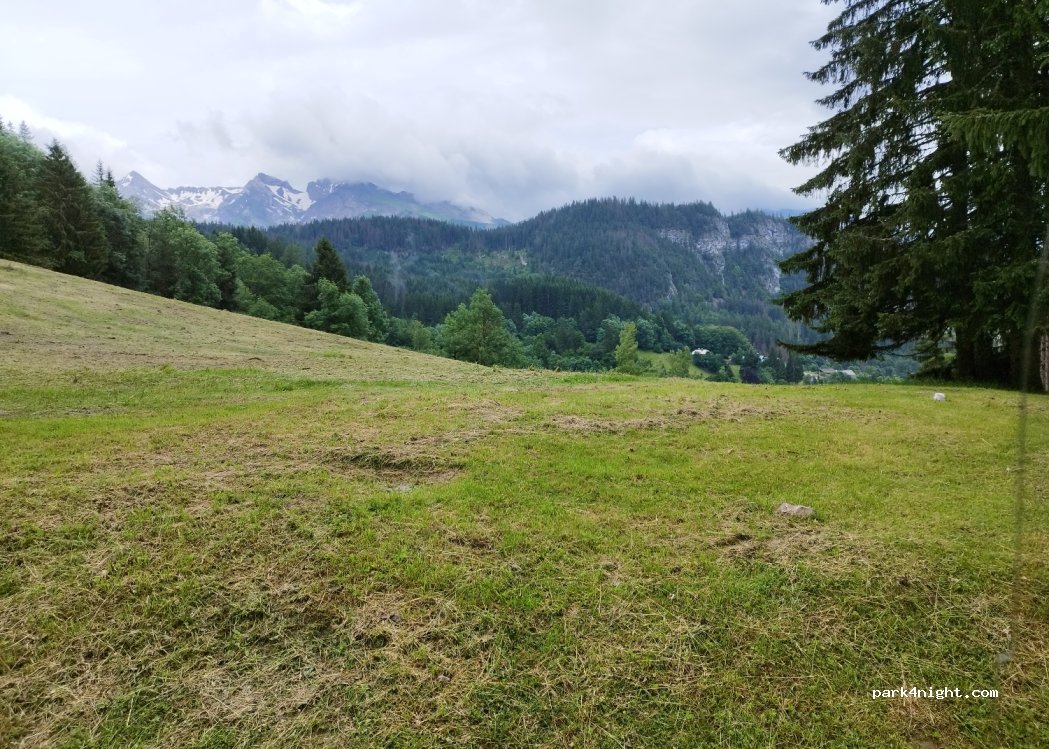 Aparcamiento frente a la Aiguille de la Clusaz. Pequeño camino empinado. Accesible en autocaravana.
