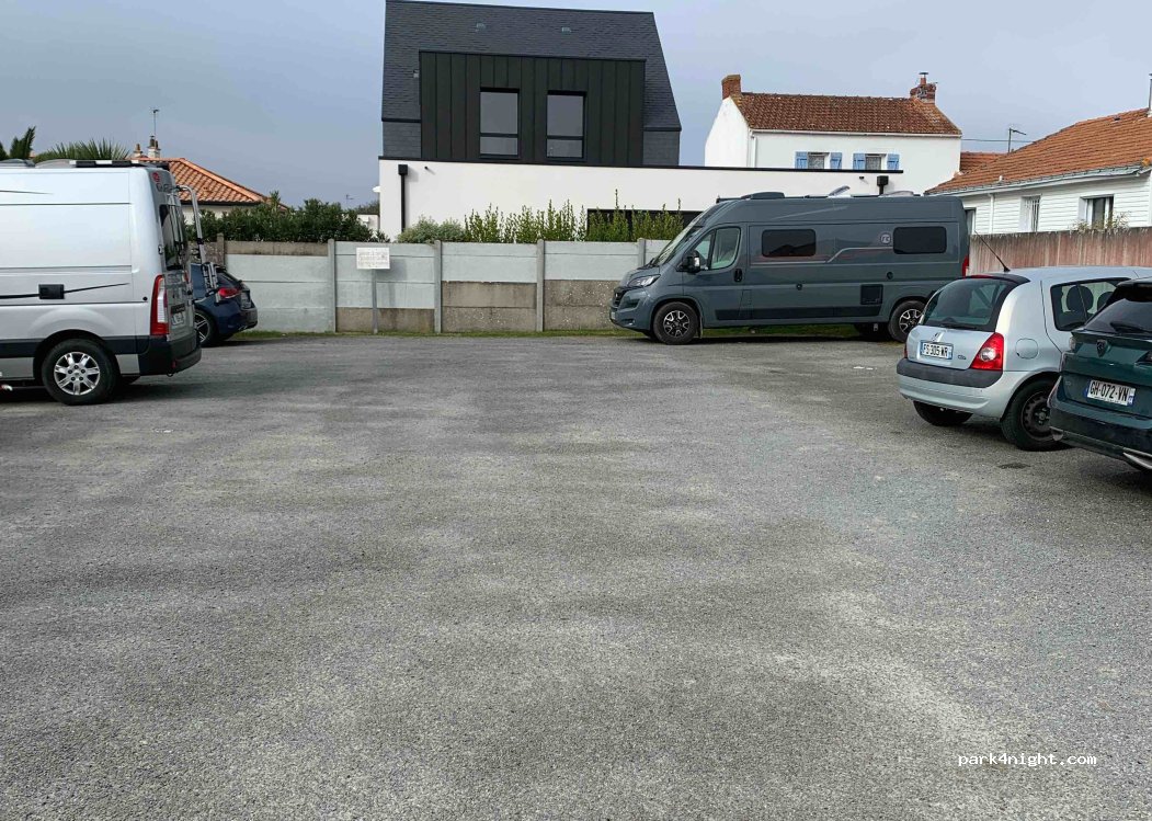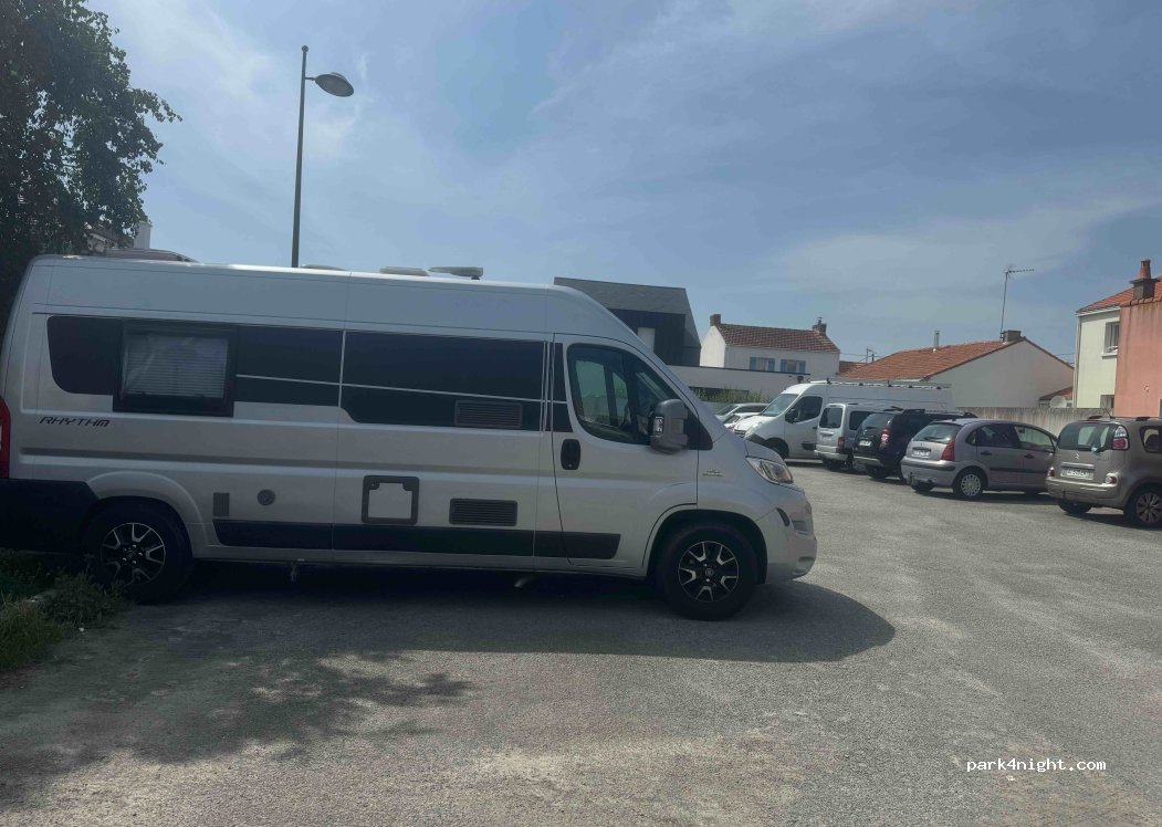 Parking sur bitume presque plat avec voitures. Bien pour 6.50 m. Très calme et sécur. 6 à 8 places. Pas enthousiasmant entre des murs mais bien pratique pour une halte nuit et jour pour visiter Pornic. Port et commerces à 1 km à pied. Nombreux resto