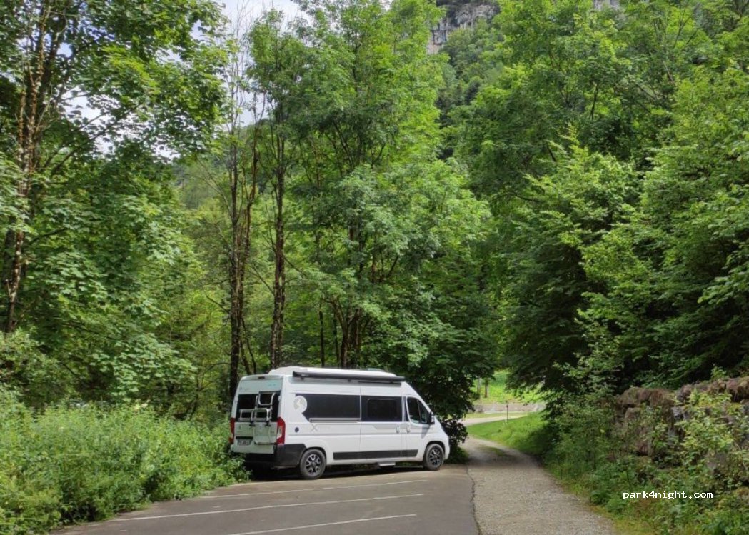 Parking with possibilities to sleep in the evening, 4 picnic tables in the woods, 5 bench to admire the waterfall. Go to the end of the small car park to be quiet.