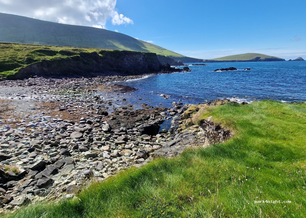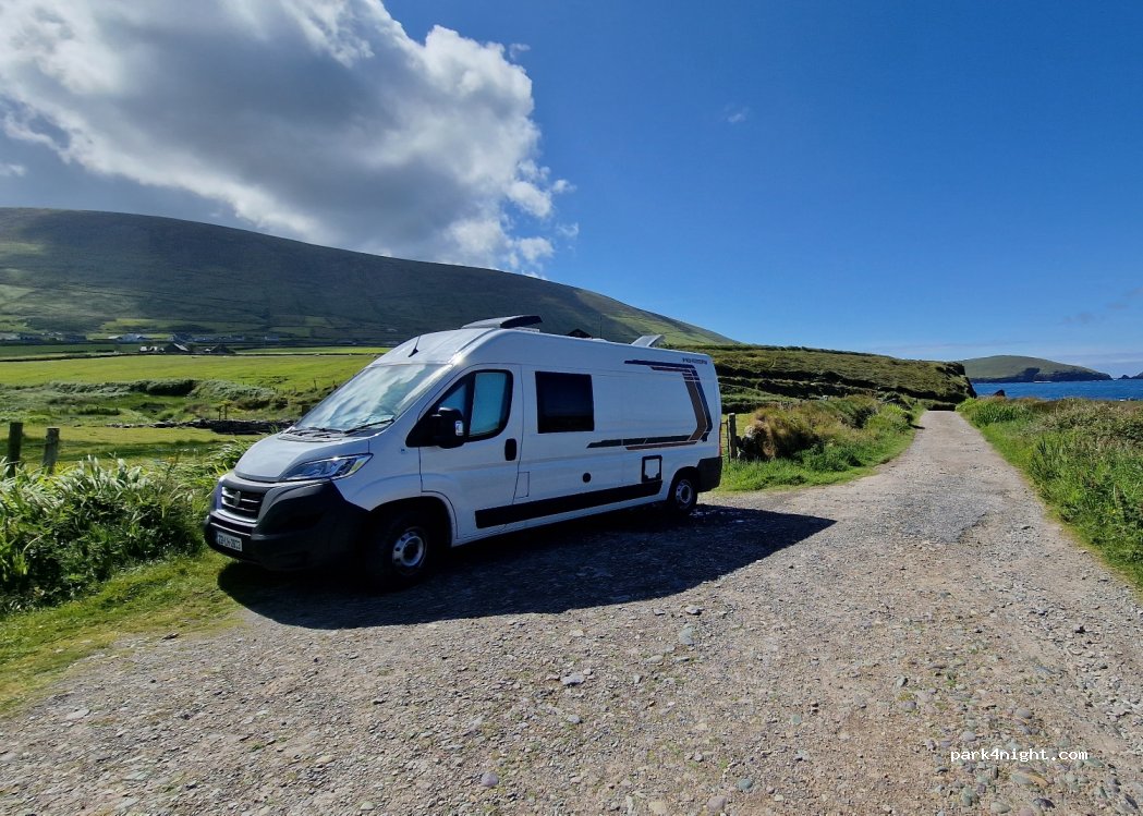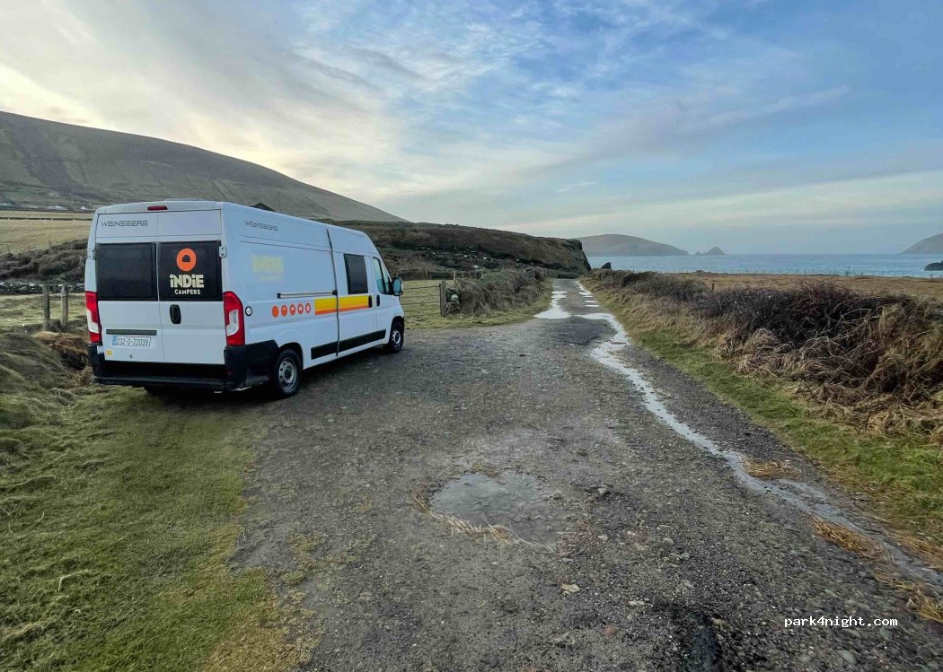 Cul-de-sac, en contre bas à 50 m du parking du Blasket center, le long du chemin. N'y passent que les employés du centre et quelques randonneurs. Superbe point de vue, accès pédestre à une petite crique. Nous y avons passé une nuit extra.