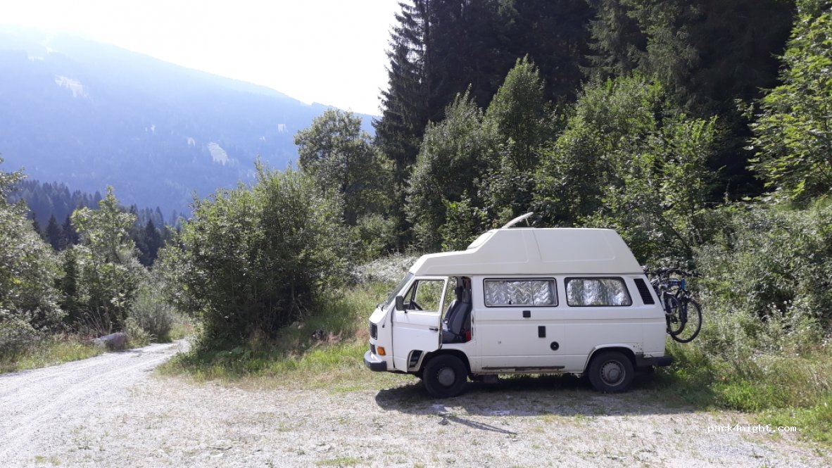 Emplacement pour un van au bord d'une route forestière avec très peu de passage. Nuit très calme et fraîche avec le bruit du torrent qui coule juste à côté. Vue sur les montagnes.