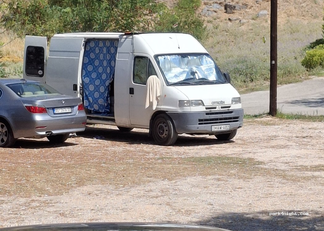 Grand parking totalement vide en ce mois d'août. Robinet à droite vers les bateaux face à la mer. Belle plage. À 10mn à pied de la sympathique petite ville. Entouré de restos. Calme.