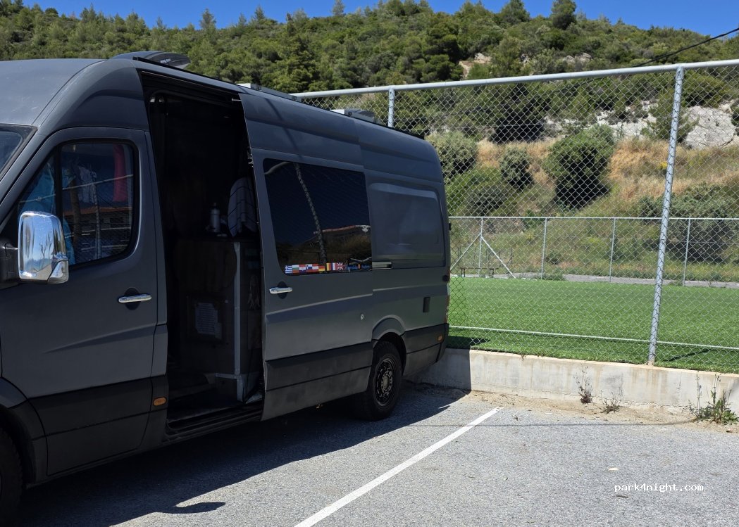 Good flat park up on tarmac. Next to an outdoor football pitch. Teams can play until 10:30pm but very quiet after that. Only a few metres across the road from a beautiful sandy beach. Locals ok with us being here. Great park up, would return
