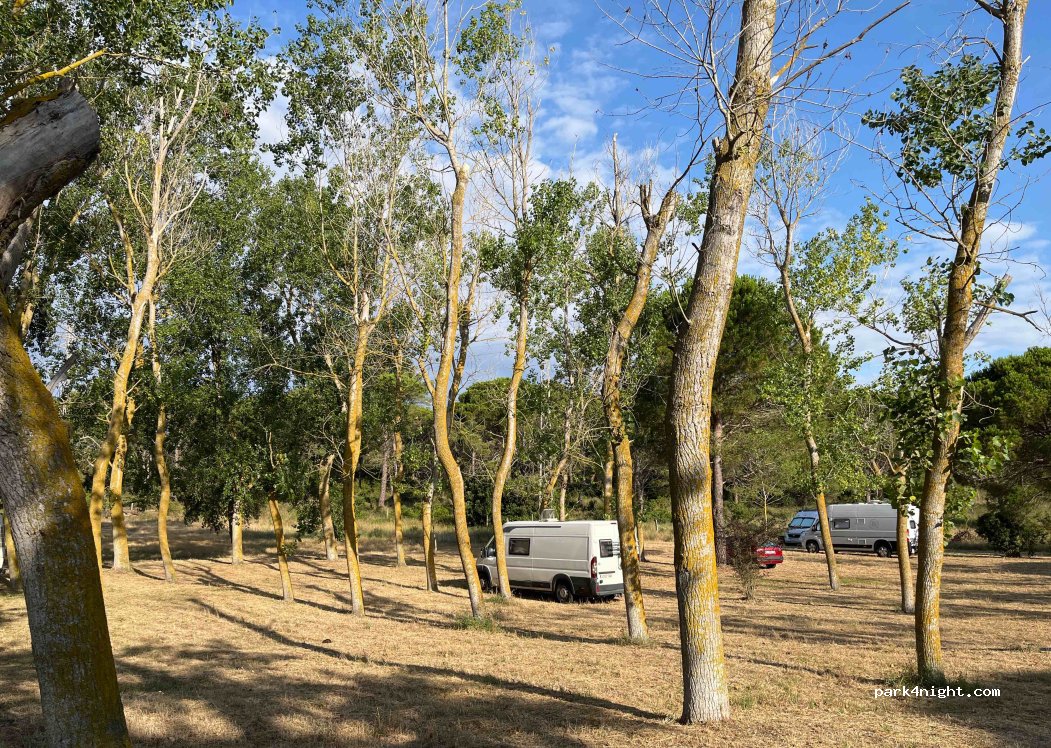 Gratuito. No tiene servicios. Aparcamientos muy amplios para AC grandes, sin nivelar y de tierra. Con sombra. A 15 min andando del pueblo y del bus de las playas. Es una chopera detrás del campo de fútbol. Se pernoctar pero no acampar. Gente paseando al perro. Noche tranquila.