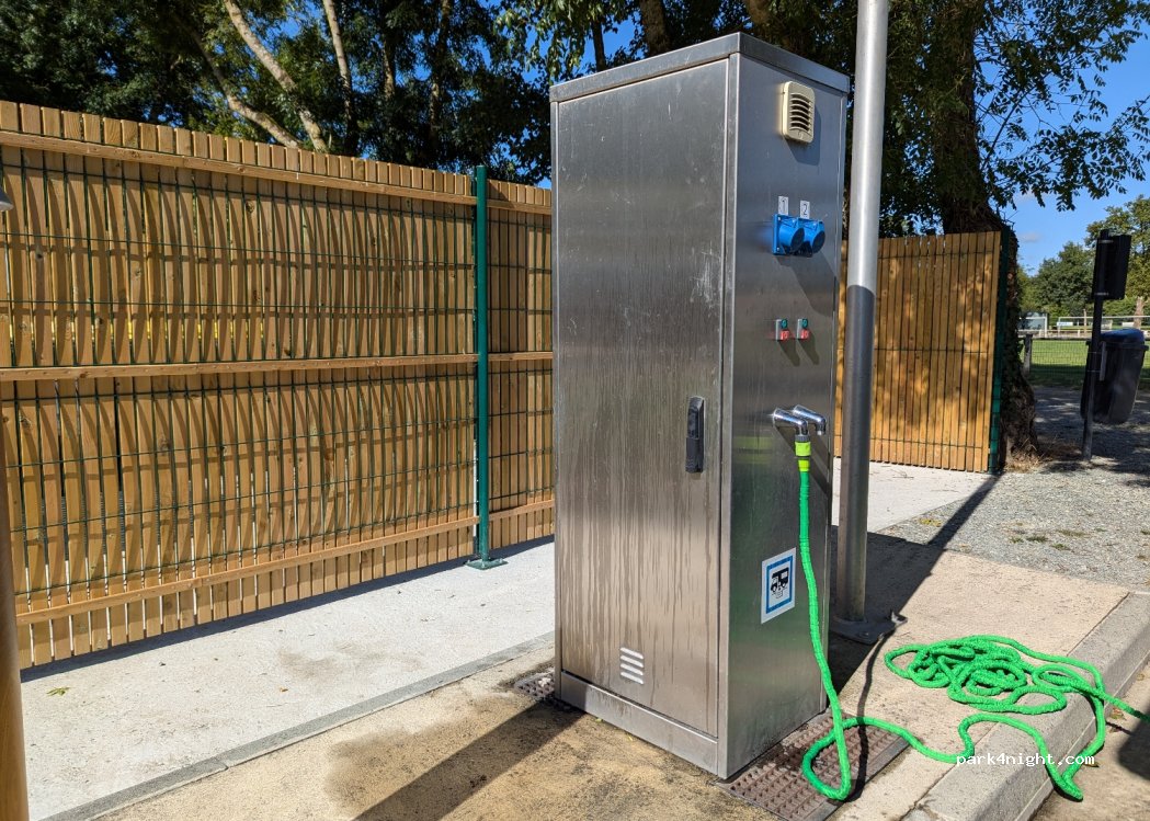 Emplacement personnel ombragé + électricité. Toilette avec papier + douche chaude état correct le top du top, bac à vaisselle + à linge, je recommande vraiment cette aire ;-) et la vidange est bien placé.