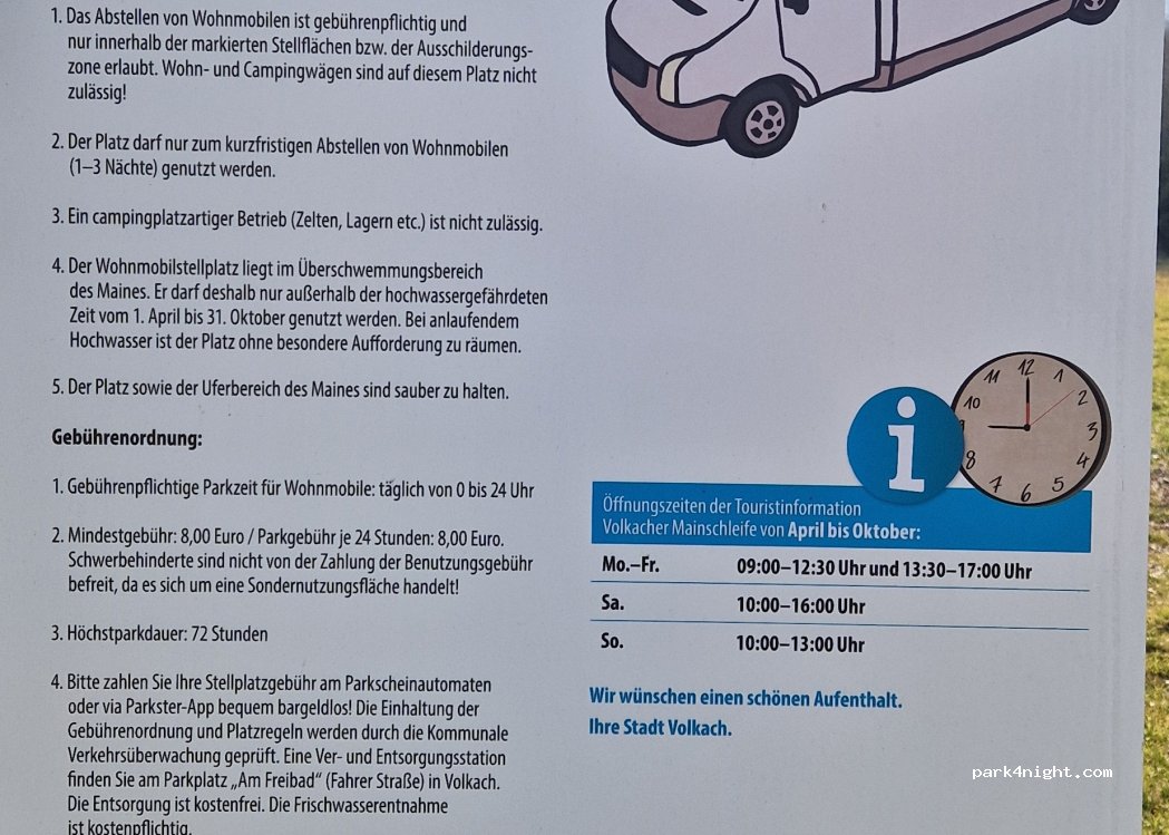 !Wichtig der Automat nimmt nur Münzen!Sehr schöner Stellplatz, ruhig direkt am Main. Wir hatten eine gute Zeit hier. Empfohlene Stehdauer sind 1-3 Tage laut Schild.