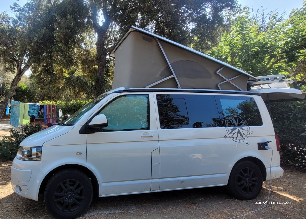 Groot bungalowpark met campingplaatsen. Tijdens ons verblijf (een weekendavond begin oktober) was het park bijna uitgestorven. Camperplaatsen tussen de bomen. Naar strand is een steile klim. Daarentegen een mooi klein zwembad met een prachtig uitzicht over de zee en bergen. Sanitair was verzorgd, helaas geen heet douchewater. we betaalden 29 euro voor een nacht.