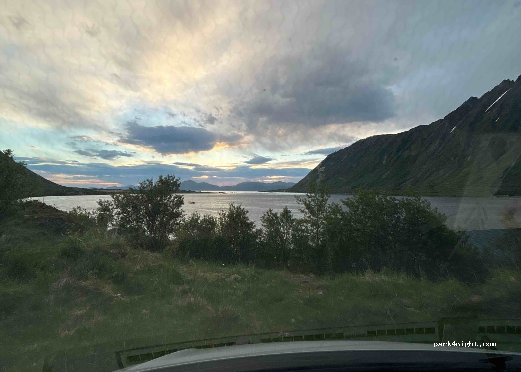 Parking juste au bord de la route mais ça vaut le coup pour voir un magnifique soleil de minuit. La nuit a été très calme pas de voiture. Nous étions 3 vans