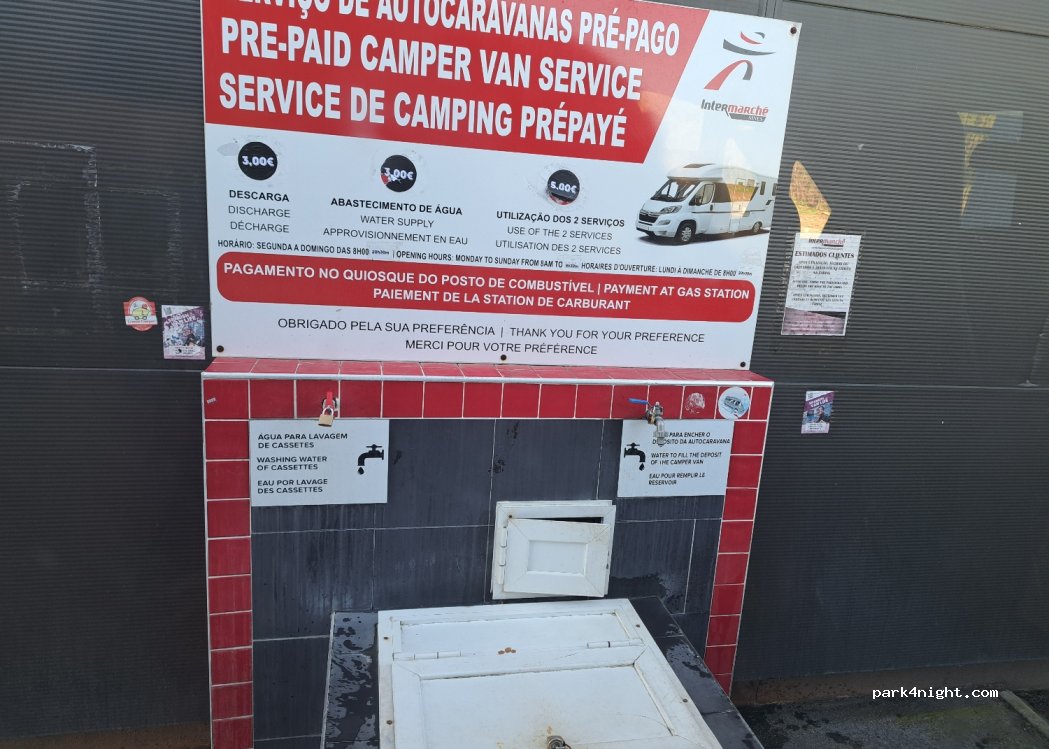 O local oferece despejos das aguas cinzas e negras alem de ter agua potavel gratuitos e fecha as 20hrs. E possivel pernoitar sem ruidos no local. Dentro do Intermarche tem WCs maa nao tem banho que ficam disponiveis ate as 20hrs. No local tem machinas para lavar e secar roupas mas o servico tem taxas. A diretoria do Supermercado Intermarche esta de parabens...