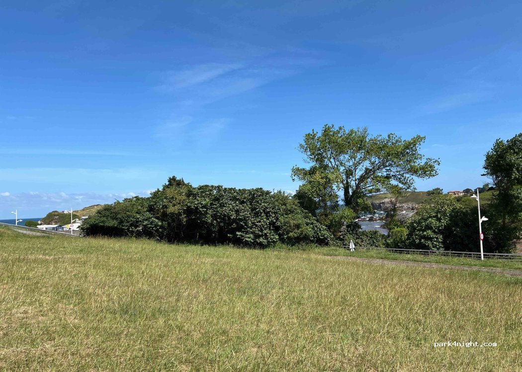 Aparcamiento frente a un pequeño restaurante, justo después del camping. Perfecta para aparcar y disfrutar de la playa y del pueblo de alrededor. Tenga en cuenta que el aparcamiento está en una pendiente, a tener en cuenta si viaja en autocaravana.