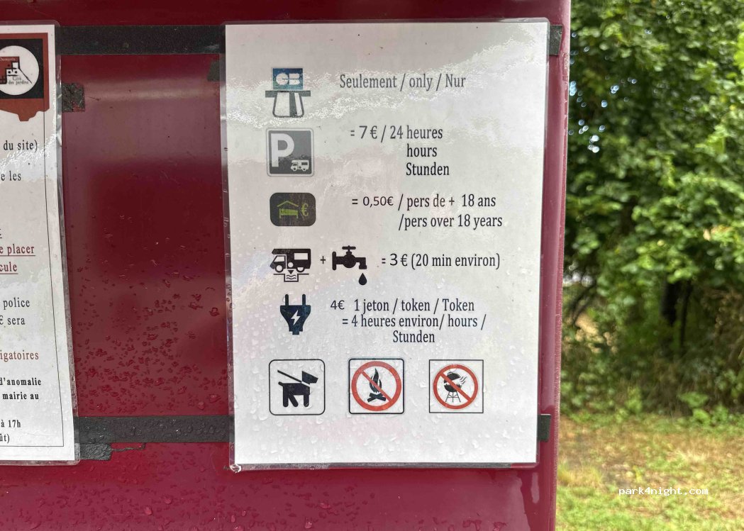Malgré le bruit de la route, cette aire est disponible toute l’année. Si vous ne voulez pas payer pour la vidange de cassette, il y a une trappe à soulever devant la borne. Quand aux 0,60cts par personne, cela correspond à la taxe de séjour et non aux personnes supplémentaires dans le cc. Merci à la municipalité. Et à 4 euros la nuit, on ne peut pas dire que le prix soit exorbitant.