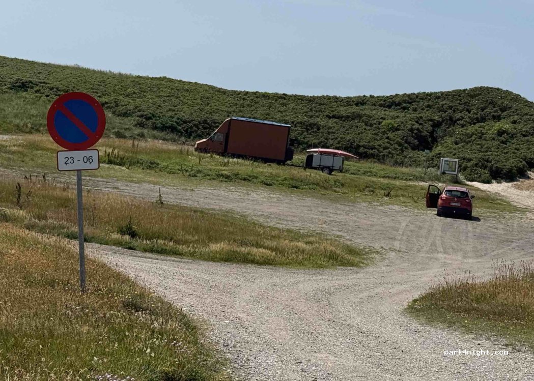 Lohnt nur wenn man tagsüber windgeschützt stehen will. Halteverbotschilder von 23:00 bis 06:00 Uhr. Kein Meerblick.
