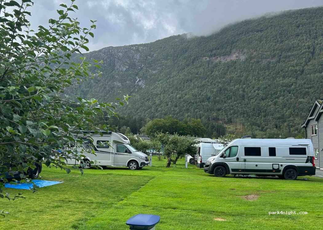 Hat alles, was man braucht. In Terrassen angelegt, Untergrund Gras oder Schotter. Man hört die Hauptstrasse und ab und zu die Kinderanimation des Freizeitparks. Tolle Aussicht auf den Fjord und die Berge. Der Platzwart ist etwas speziell, aber nicht unfreundlich. Gegen Abend lässt der Park das Chlorwasser der Filter in den Fjord laufen. Fanden wir nicht so toll. Kann aber der Platz nichts für.
