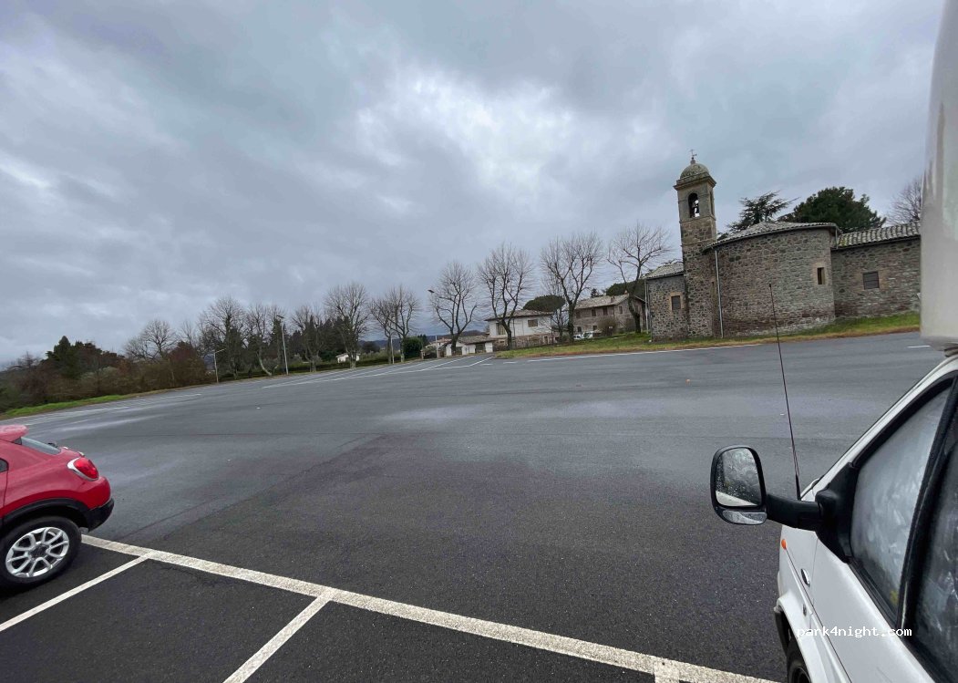 Parcheggio in piano (asfaltato) e illuminato, nessun divieto esplicito per camper (aree per auto e per autobus). Piccola chiesa nel parcheggio e alcune abitazioni nei pressi degli stallo