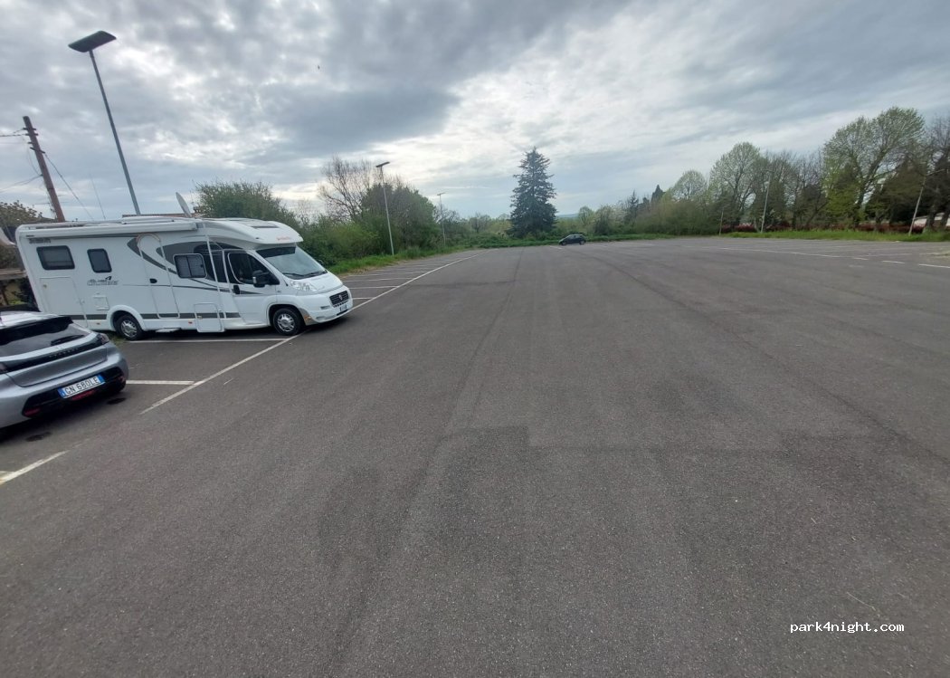 Parcheggio molto comodo e grande anche per i camper più grandi c’è spazio dietro parcheggiando in retromarcia. Molto silenzioso e illuminato tutta la notte. Non ci sono cassonetti della spazzatura nelle vicinanze. Sul fondo posteggi leggermente in pendenza.