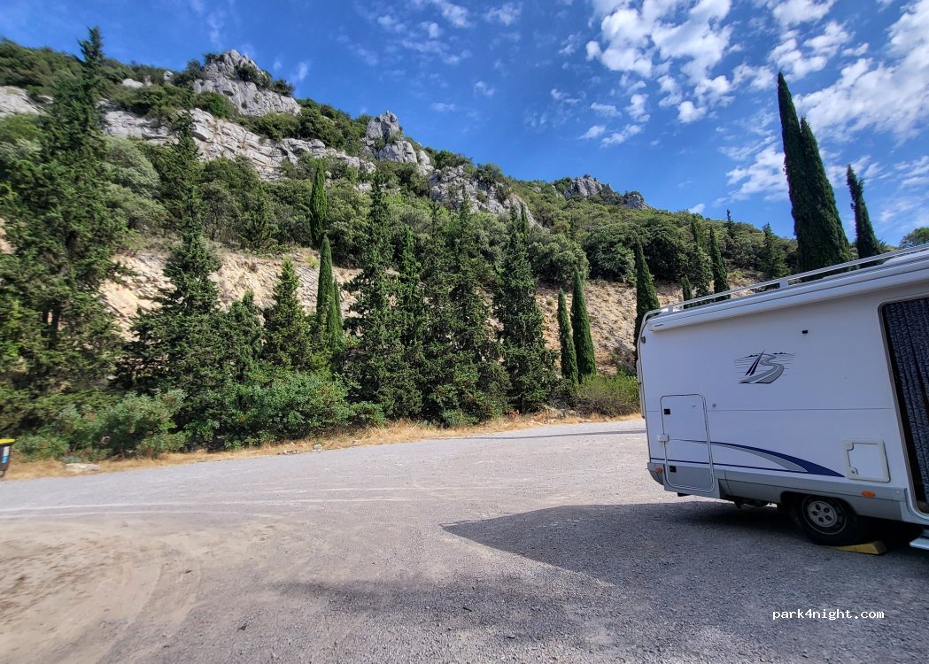 Grand parking, un peu d'ombre le matin. Accessible même pour les grands camping-car de de 7m, route en sens unique. Grottes remarquables à visiter !