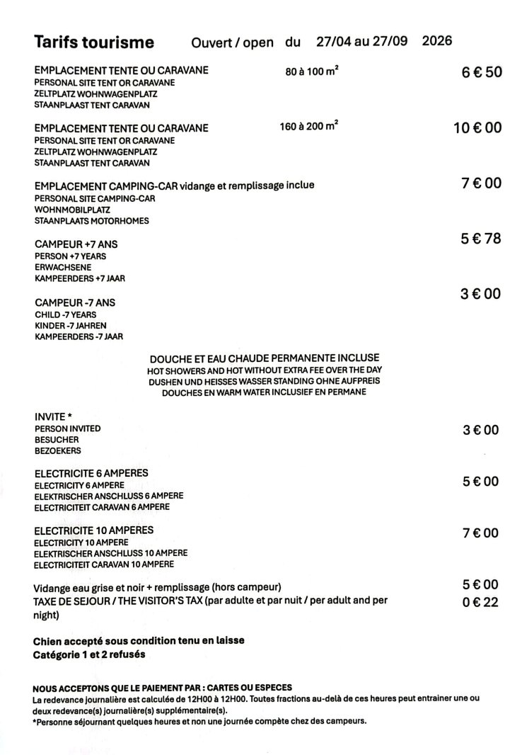Accueil agréable enfin un camping avec de la place en saison. Prix raisonnable 27€ 2 adultes un cc 3 enfants et un bébé sans électricité. Eau incluse. Camping très propre avec toutes les commodités même un toilette enfant et une baignoire pour bébé. Sans hésitation je recommande.
