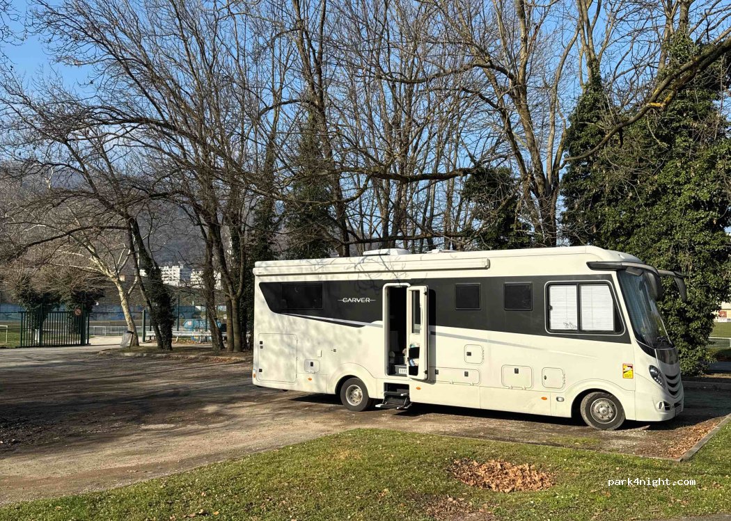 Nous sommes arrivés à Grenoble après la fermeture du camping tout proche. Nous avons passé une nuit tranquille et agréable ici. Après l'entraînement, les voitures quittent le parking, et à la tombée de la nuit les jeunes aussi. L'accès est en chicane, avec un panneau de largeur limitée à 2,10 m mais nous sommes très bien passés avec un camping-car de 2,35 m de large. Poubelle et tri sélectif.