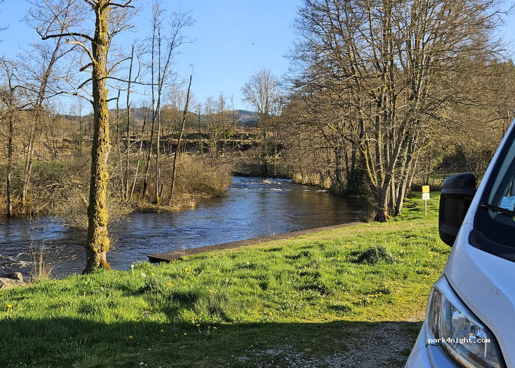 Superbe emplacement au bord de la rivière. Très grand emplacement pouvant accueillir au moins 50 camping-cars, on est déjà une trentaine et il reste de la place.